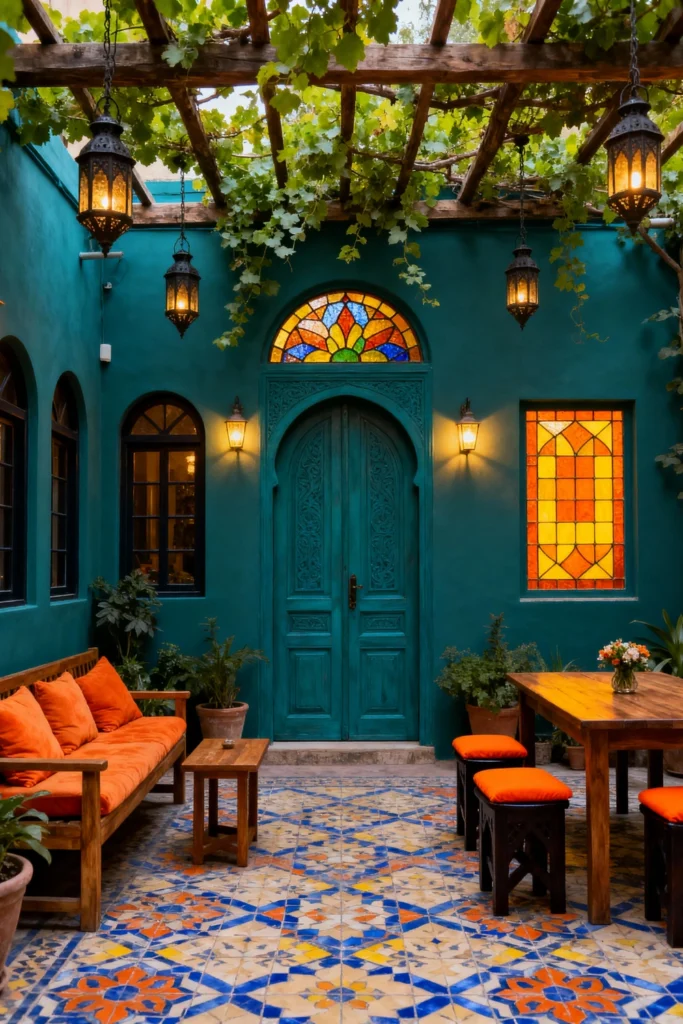 Transport yourself with vibrant teal walls and intricate mosaic floor tiles in blue and ochre. Hang ornate, antique-style metal lanterns from a wooden pergola covered in climbing grapevines. Furnish the space with a sturdy wooden bench topped with bright orange velvet cushions for a bold pop of complementary color. Add a stained-glass detail above the door to catch the light and complete the exotic, sanctuary vibe.