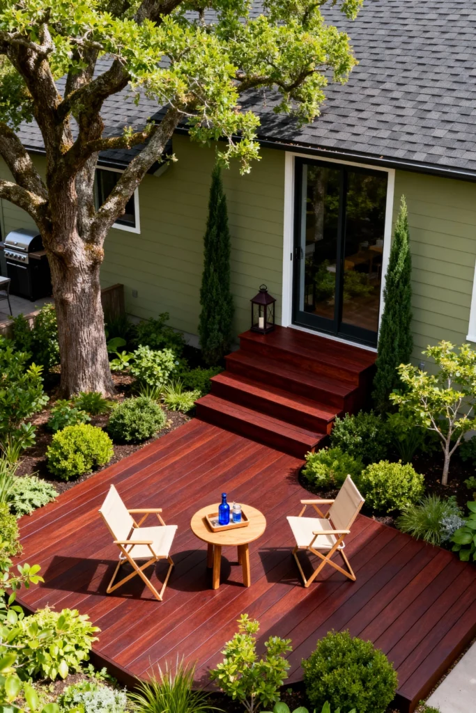 Embrace the natural landscape by building your deck around existing trees rather than cutting them down. Choose a rich, reddish timber for the decking to contrast beautifully against sage green siding. Keep the furniture minimal—just a pair of canvas folding chairs and a small teak table are enough for afternoon drinks. Let wide, generous steps lead invitingly down into a lush, fern-filled garden to create a seamless flow between the architecture and the earth.