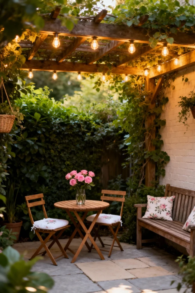 Let lush ivy take over the walls to create a living, breathing backdrop that feels secluded. String warm Edison bulbs under a rustic wooden arbor to create an intimate, bistro vibe. Set up a small wooden folding table and chairs for alfresco dining for two. Place a vase of fresh pink roses on the table to add a touch of romance and soft fragrance to the heavy evening air.
