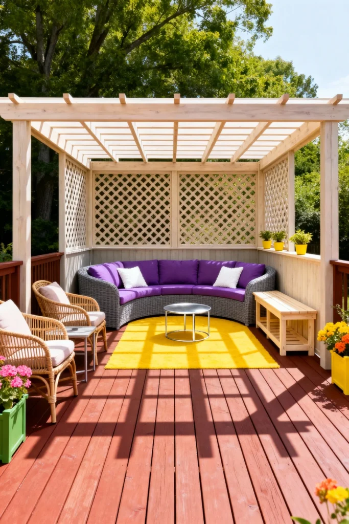 Don’t be afraid of bold color; define the space with a bright yellow area rug that screams sunshine. Pair it with a curved, purple sectional sofa for a fun, unexpected contrast that feels energetic. Use a light wood pergola with lattice screens to filter the harsh midday light and add architectural interest. Finish the look with potted yellow flowers on the ledge to tie the vibrant color palette together perfectly.