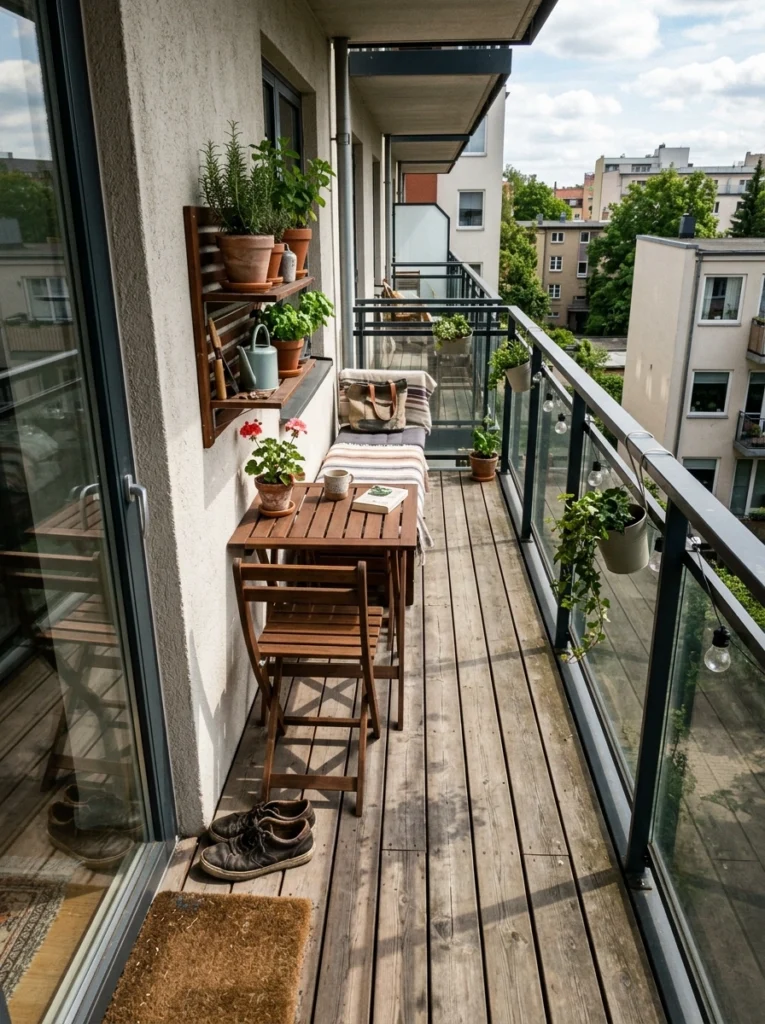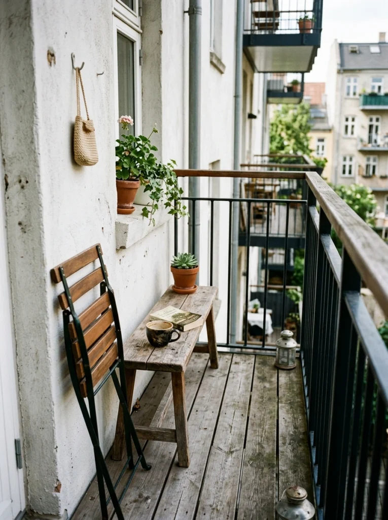 When space is at a premium, standard patio sets are your worst enemy. Instead, lean into compact patio inspiration. Think wooden folding chairs that can be hung on the wall when not in use, or nesting tables that tuck away. A slim, backless bench pushed against the wall offers seating for two without eating up the visual space a bulky chair would.