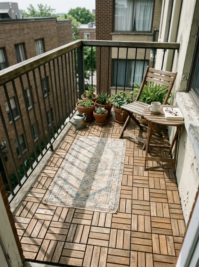 First things first, that stained concrete has to go. Covering the floor instantly shifts the vibe from “fire escape” to “outdoor lounge.” Interlocking wooden deck tiles or a weather-resistant outdoor rug are the ultimate renter-friendly balcony décor. They require zero tools to install, hide ugly floors, and make walking barefoot outside actually appealing.