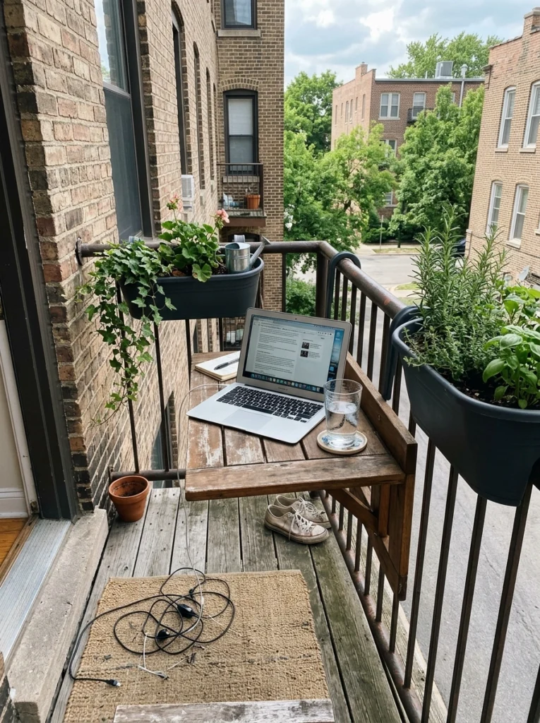Why buy a table that eats up floor space when your railing is right there? A fold-down railing table is a game-changer for small balcony ideas. You flip it up for your laptop or dinner, and drop it down when you want to stretch your legs. Pair this with railing-mounted planters facing inward so you can actually enjoy the blooms.