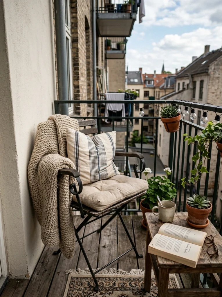 Nobody wants to sit on stiff, cold metal. Creating a cozy balcony setup is all about the textiles. Bring out thick, weather-resistant seat cushions, a casually draped throw blanket for chilly evenings, and maybe a small floor pouf that can double as a footrest or an extra seat. Layers soften the harsh lines of a concrete balcony.
