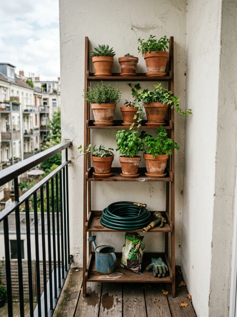If you can’t build out, build up. Treat your exterior walls like premium real estate. Installing a slim ladder shelf or using heavy-duty outdoor command hooks allows you to store watering cans, extra blankets, or trailing plants without touching the floor. Vertical storage draws the eye upward, making the ceiling feel higher and the space less cramped.