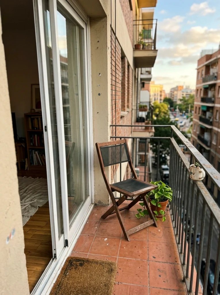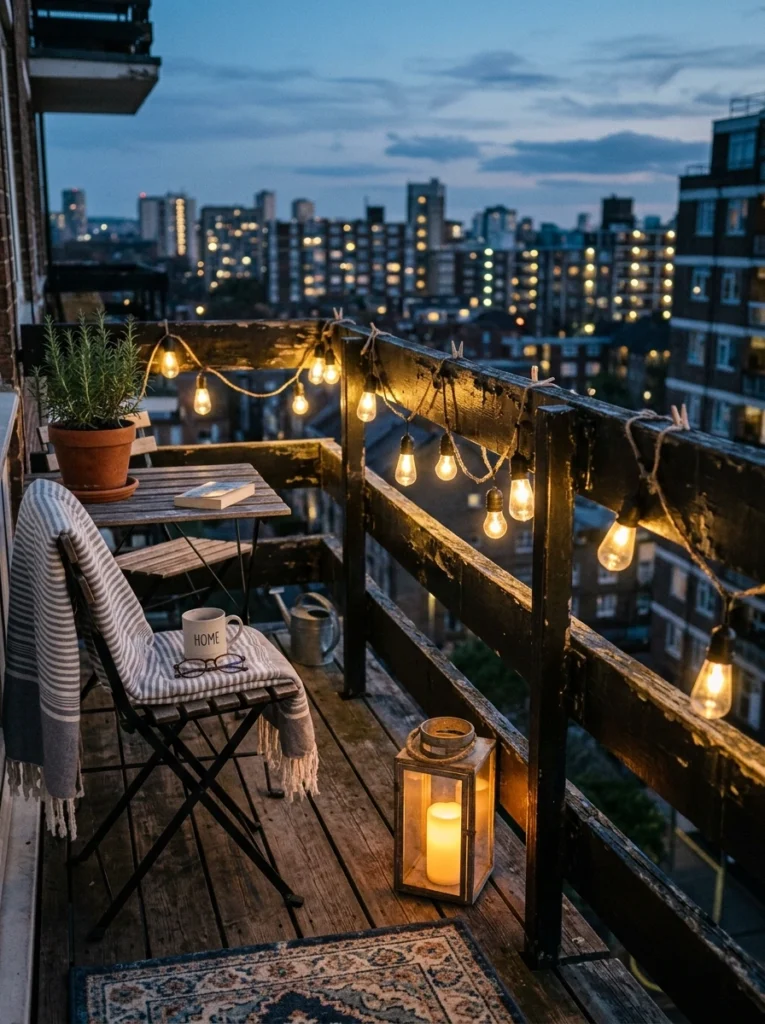 Harsh overhead lighting ruins a chill mood instantly. You want soft, warm glows. String up some solar-powered café lights along the railing or ceiling. Add a couple of battery-operated floor lanterns in the corners. It’s cheap, incredibly effective, and makes the space look magical from both the outside and inside your apartment.