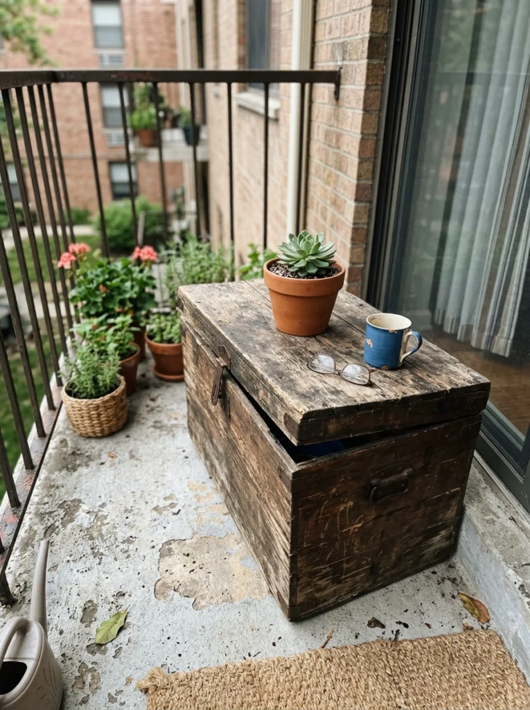When every inch counts, everything needs to have two jobs. A sturdy, hollow storage box can serve as a side table for your drinks while hiding your potting soil, extra string lights, and garden trowels inside. This keeps the visual clutter at zero while maximizing utility.