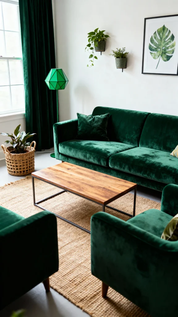 Deep greens bring a refreshing touch to your living room, making it feel like a cozy retreat. Pairing these shades with natural textures and plenty of plants enhances the earthy feel. It’s all about creating a serene space where you can unwind and connect with nature, right at home.