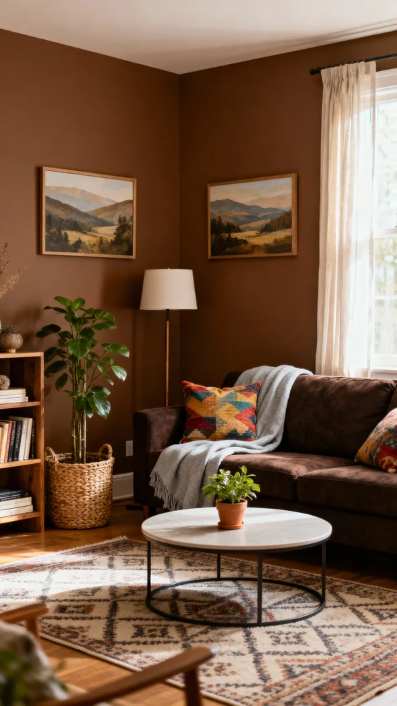 Rich chocolate browns bring a cozy vibe to your living room. They create a warm and inviting atmosphere that’s perfect for relaxing or entertaining. Pairing these deep shades with natural elements enhances the earthy feel of your space.