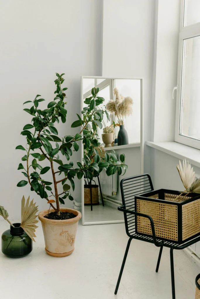 Use your plants and decor to reflect light and create the illusion of more space! Placing a large, floor-length mirror next to a sizable houseplant, like this lovely Ficus in an antique-style pot, immediately doubles the greenery. The simple, modern mirror frame contrasts beautifully with the organic shape of the plant. Add in warm, textured pieces like the rattan basket and dried grasses to complete this airy, modern-boho vibe.