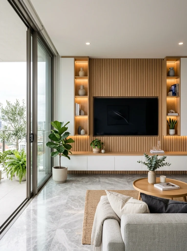 Bringing the outdoors in is always a great idea. This setup thrives on an intentional, breezy vibe with its vertical wooden slats and warmly lit display shelves. A simple potted fig and a few curated ceramics are all you need here. Keeping the white floating console clutter-free allows the organic textures to stand out beautifully, blending perfectly with that gorgeous balcony view.