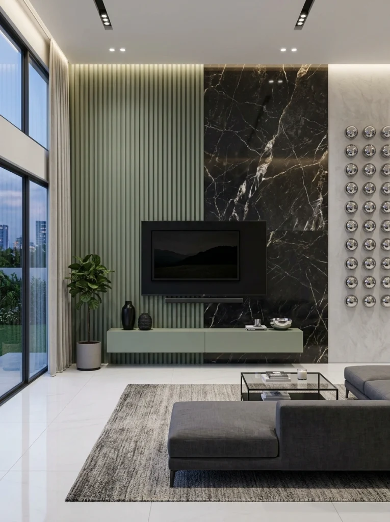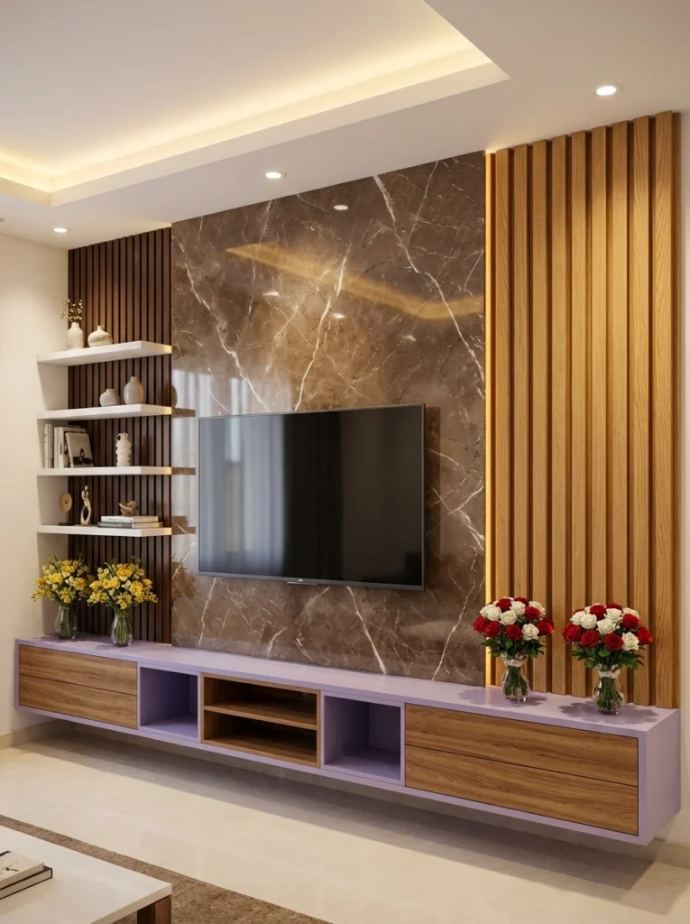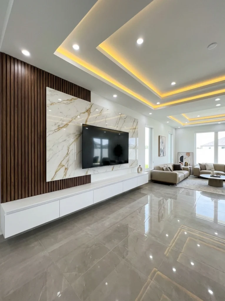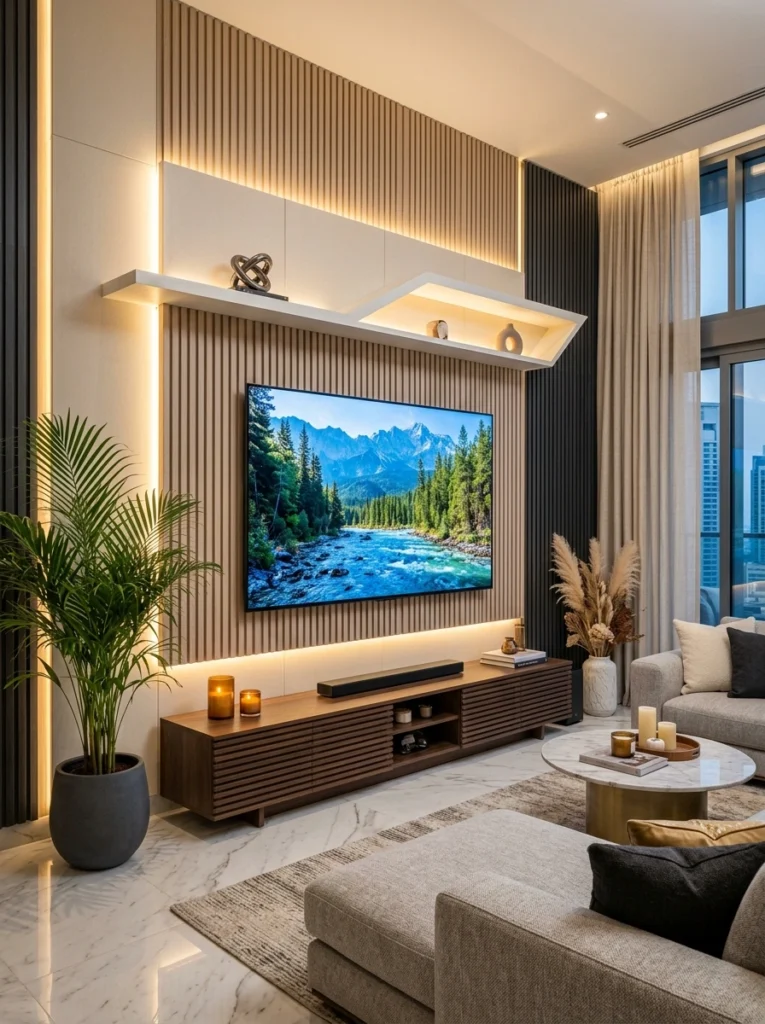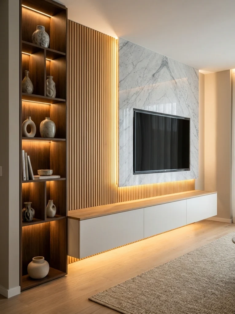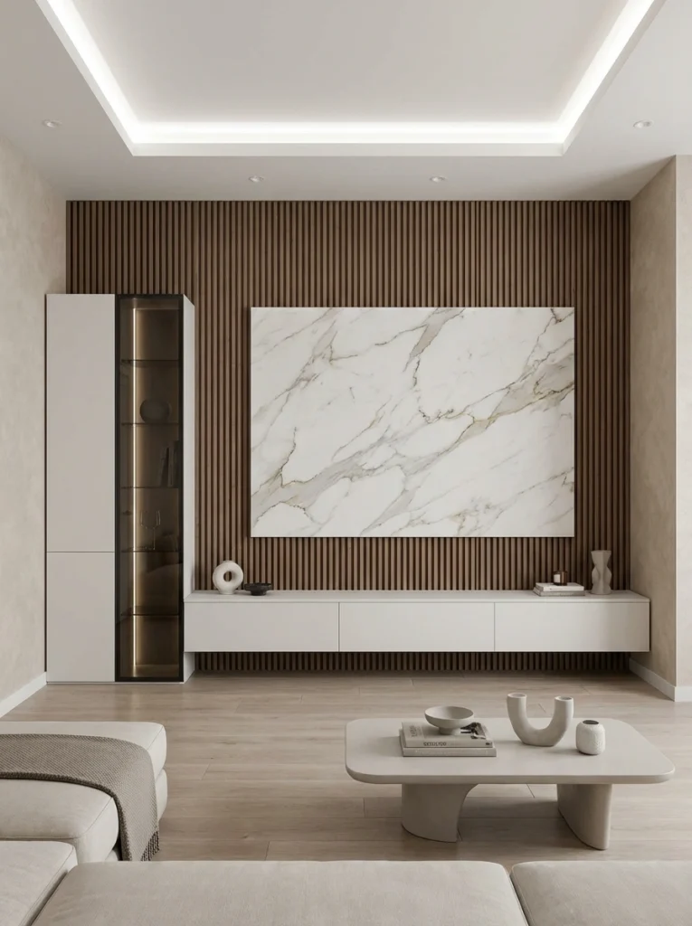 If you have a large, open-concept space, don’t be afraid to go big! A massive, beautifully veined stone slab serves as the ultimate luxurious anchor for your screen. Flanked by deep, rich wooden slats, it brings immense character to a blank wall. The extended white floating console seamlessly ties into the glossy floors. Less is definitely more when your materials are this striking and authentic.