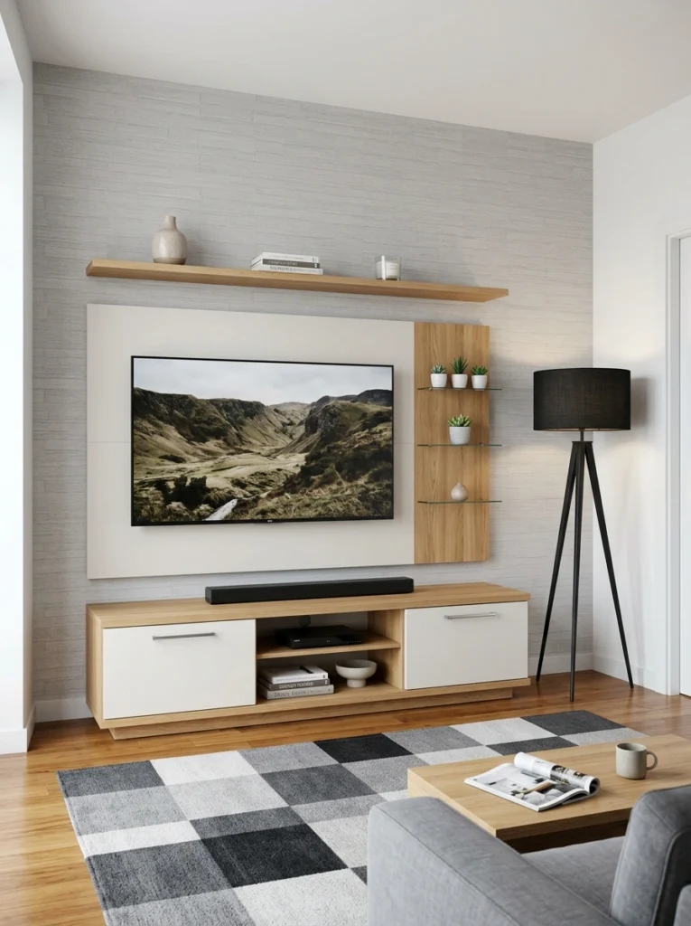 If you’re looking for something simple, approachable, and stylish, this is it. A two-toned asymmetrical panel—mixing crisp white with a touch of warm oak—creates a fantastic focal point against subtle textured wallpaper. I adore the dainty glass shelves for displaying tiny succulents; it feels so personal. Paired with a sleek black tripod lamp, it’s the perfect, uncluttered setup for a relaxing living area.