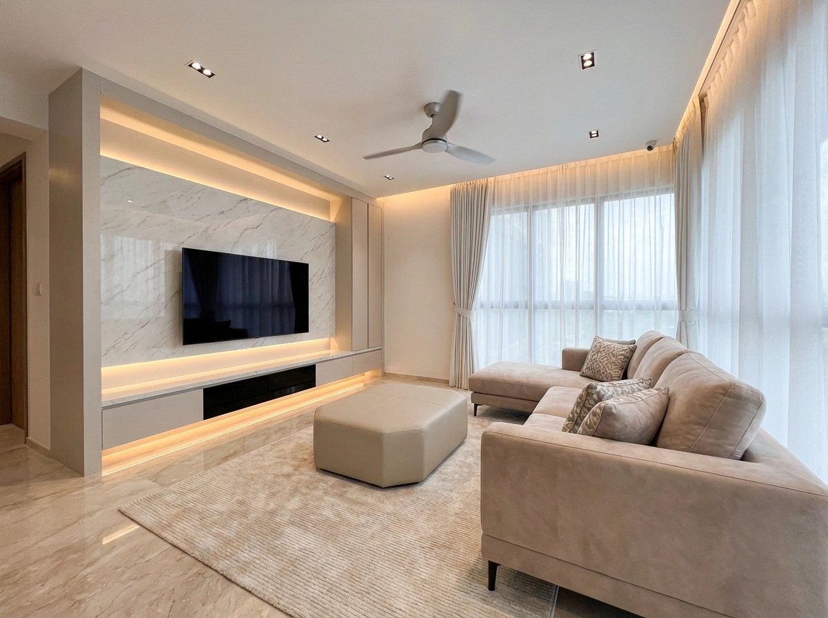 If you have a large, open-concept space, don’t be afraid to go big! A massive, beautifully veined stone slab serves as the ultimate luxurious anchor for your screen. Flanked by deep, rich wooden slats, it brings immense character to a blank wall. The extended white floating console seamlessly ties into the glossy floors. Less is definitely more when your materials are this striking and authentic.