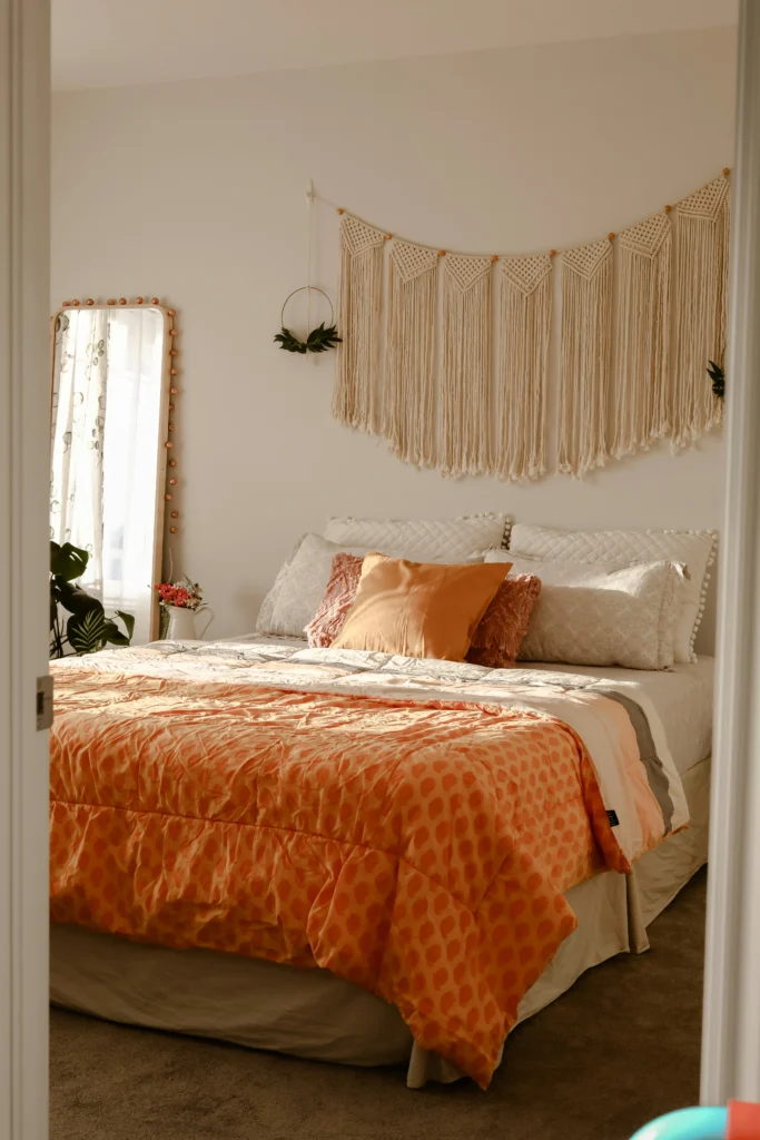 Style: Bohemian Bright This space is all about sunny, good vibes! The vibrant orange duvet is a burst of energy, perfectly complemented by the soft textures. The large macramé wall hanging is a beautiful focal point that introduces that quintessential relaxed, earthy boho feel. The mirror leaning against the wall is an easy trick to make the room feel bigger and brighter.