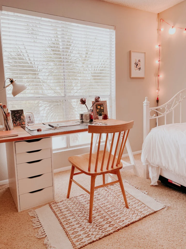 Style: Feminine Cottagecore This space is light, bright, and perfect for both sleeping and getting some work done. It has a sweet, gentle aesthetic with its white iron bed frame and soft, natural light streaming through the blinds. The string of fairy lights and simple floral art add a touch of youthful, whimsical charm without being messy. The light wood chair and desk combo is functional and stylish.