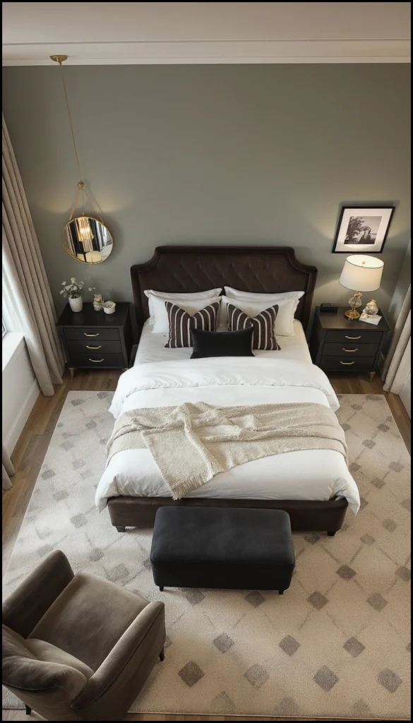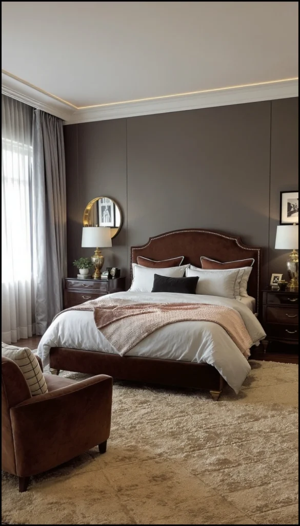 Style: Luxurious Glamour This bedroom is all about rich textures and a sophisticated color palette. The deep chocolate velvet bed and matching armchair, paired with the dusky taupe wall, create a warm, enveloping feeling. The subtle pop of pink in the throw and the gold accents on the mirror and lamps add a touch of glamour without feeling overdone. This is your go-to look for a hotel-level luxe experience.