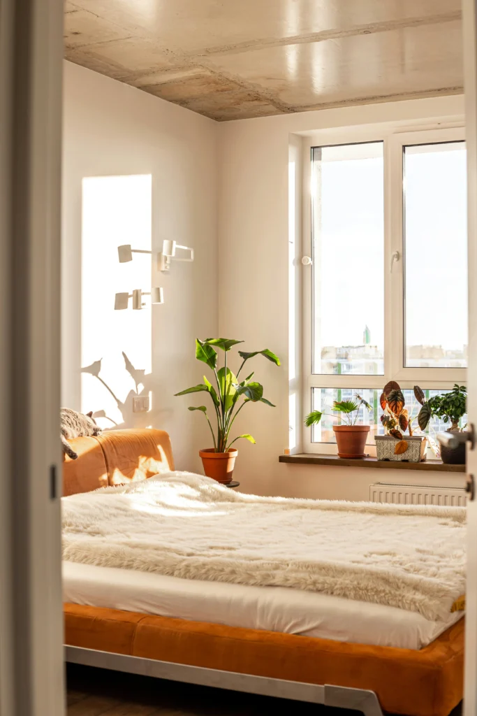 Style: Biophilic Modern This room successfully blends urban living with the restorative power of nature. The raw, concrete ceiling contrasts beautifully with the warm orange bed frame and the abundance of green house plants perched on the wide windowsill. The large window floods the room with light, creating an instantly uplifting and energetic space.