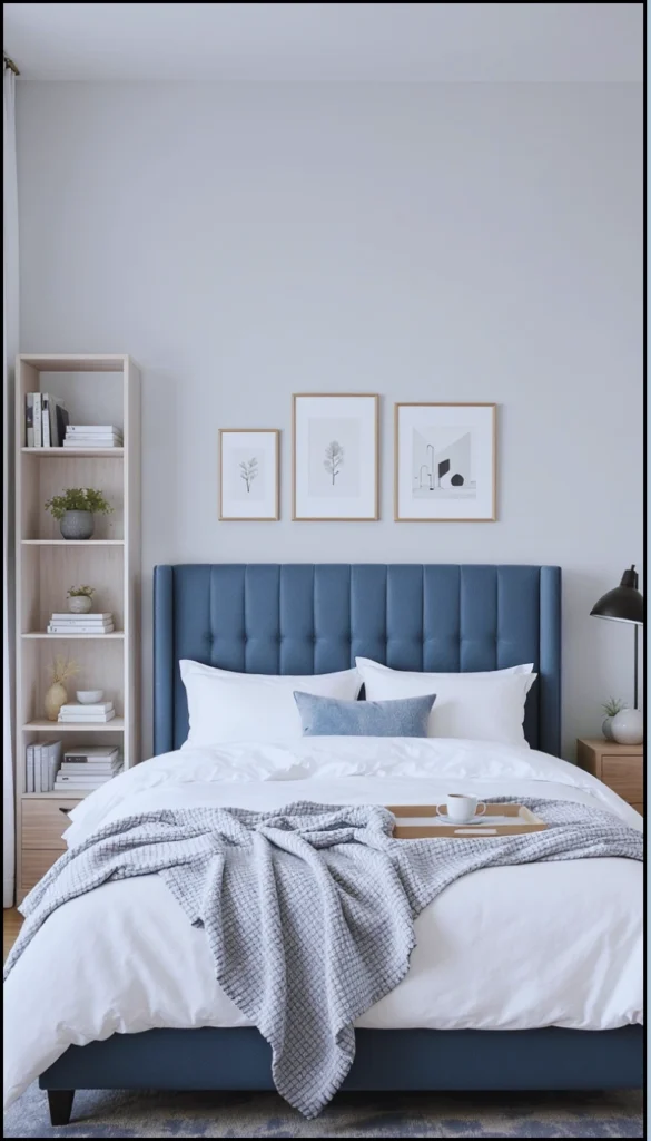 This look is all about calm and clean lines. The deep blue tufted headboard paired with crisp white bedding is an instant classic! Notice how the light grey wall color and simple, light wood shelving keep everything feeling airy. The trio of framed art above the bed adds a personal touch without cluttering the space.