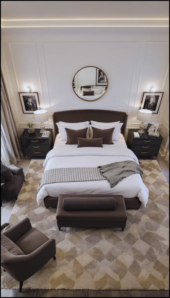 Talk about a five-star feel! This bedroom screams luxury with its rich, dark color palette and sophisticated symmetry. The dark brown velvet headboard and matching throw pillows create a cozy cave-like feeling, perfectly balanced by the white bedding. The patterned rug and gold accents add a layer of old-Hollywood glamour.