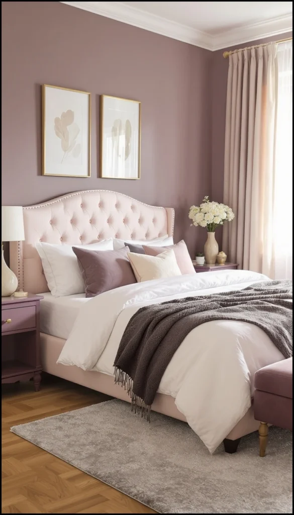 This is a beautiful example of using a deep, romantic wall color. The dusty mauve walls are rich and elegant, perfectly paired with the plush light pink upholstered bed. The pairing of light pinks and deep purples in the pillows and nightstand gives the room a sophisticated, multi-layered feminine feel.