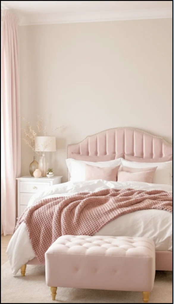 - Commit to a Color: Choose one soft color (blush, pale yellow, mint) and use different tones of it across your fabrics—headboard, throws, and pillows.