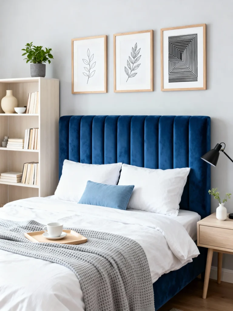 This look is all about calm and clean lines. The deep blue tufted headboard paired with crisp white bedding is an instant classic! Notice how the light grey wall color and simple, light wood shelving keep everything feeling airy. The trio of framed art above the bed adds a personal touch without cluttering the space.