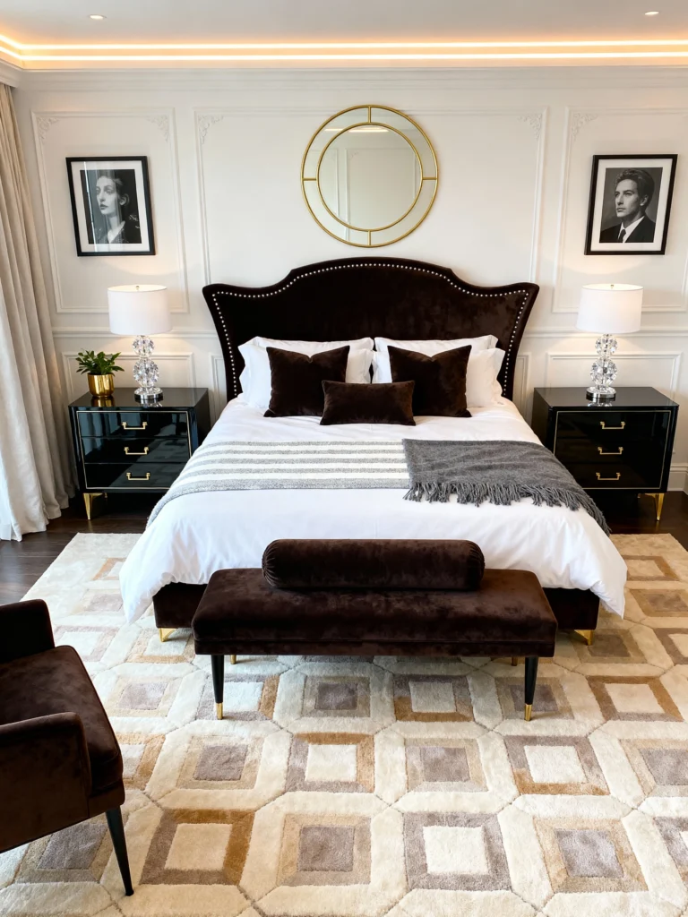 Talk about a five-star feel! This bedroom screams luxury with its rich, dark color palette and sophisticated symmetry. The dark brown velvet headboard and matching throw pillows create a cozy cave-like feeling, perfectly balanced by the white bedding. The patterned rug and gold accents add a layer of old-Hollywood glamour.