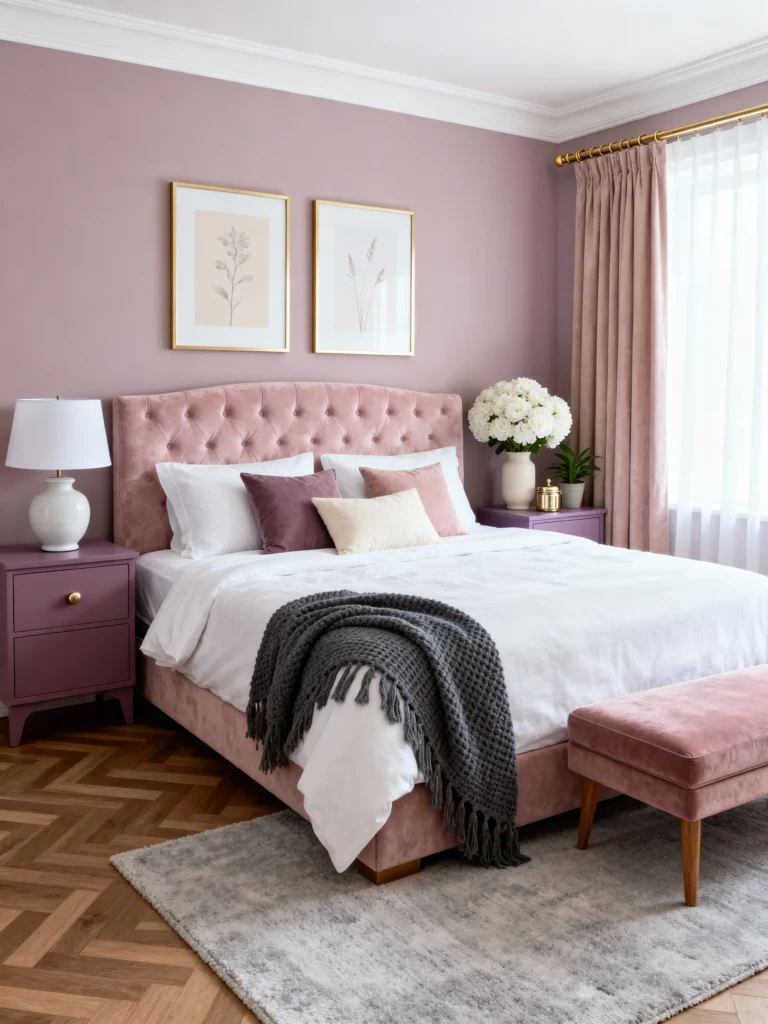 This is a beautiful example of using a deep, romantic wall color. The dusty mauve walls are rich and elegant, perfectly paired with the plush light pink upholstered bed. The pairing of light pinks and deep purples in the pillows and nightstand gives the room a sophisticated, multi-layered feminine feel.