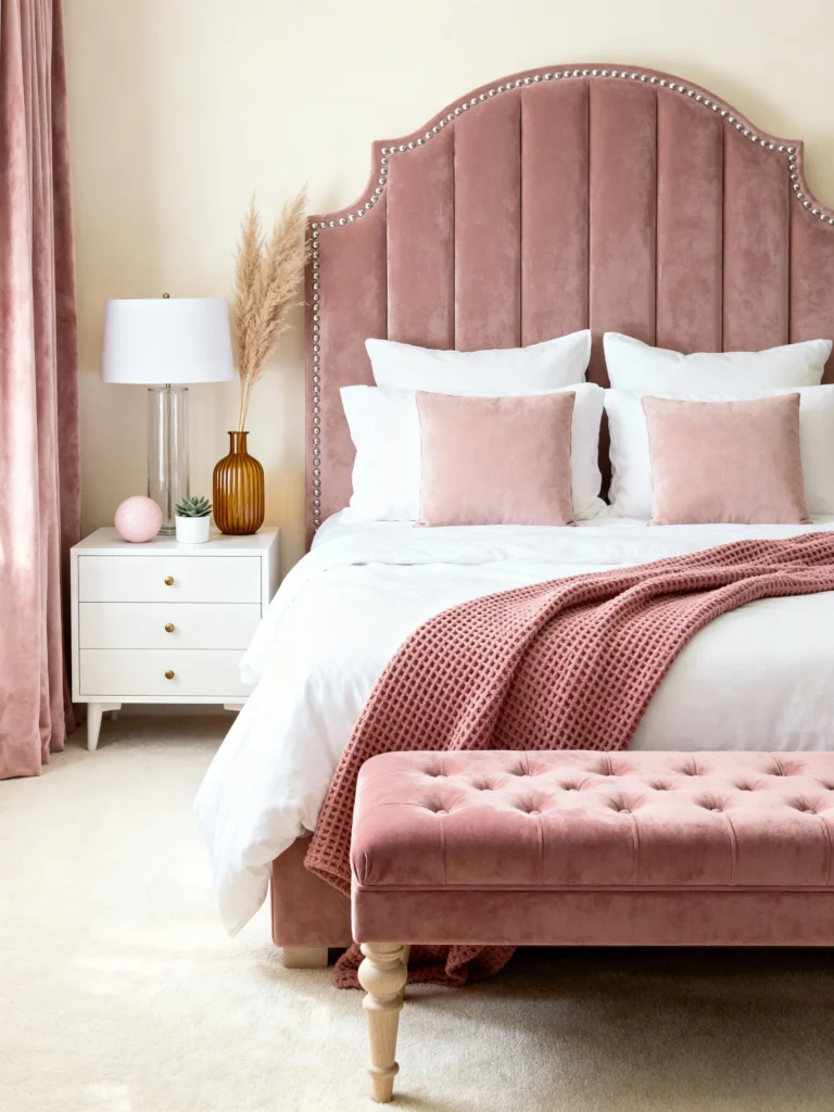 • Velvet Touches: Introduce velvet upholstery on the bed and a bench/ottoman for an immediate high-end texture.