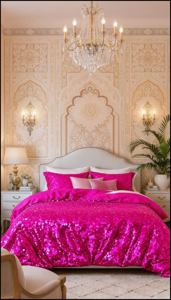 This room is pure fantasy! The hot pink sequin duvet is a daring, maximalist statement that immediately draws the eye, perfectly contrasted with the soft, intricate, carved wall paneling. The crystal chandelier and ornate gold sconces add a layer of old-world luxury, while the light neutral tones on the headboard and surrounding furniture keep the bold bedding from becoming overwhelming. It’s truly a celebration of drama and texture.