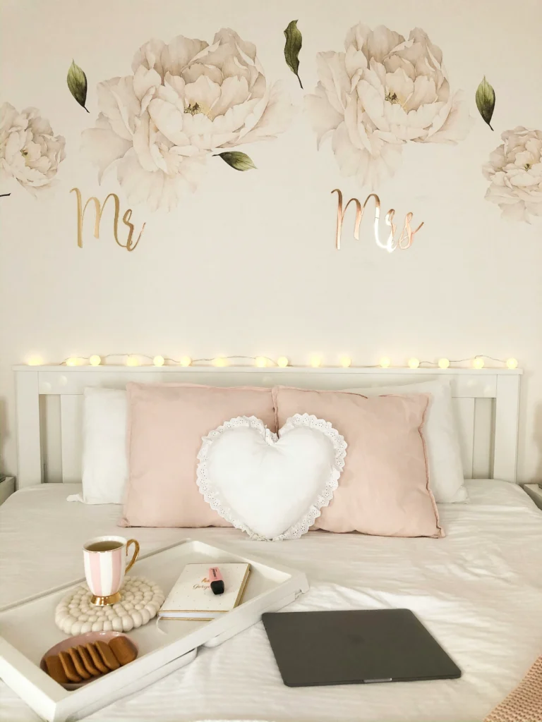 This room is sweet, soft, and unapologetically romantic! The huge, beautiful peony wall decals create a stunning, airy focal point, perfectly complemented by the soft pink and white pillows. The gold “Mr” and “Mrs” accents add a whimsical, celebratory touch, while the fairy lights over the headboard give it a warm, perpetual glow. It’s a dreamy, feminine retreat.