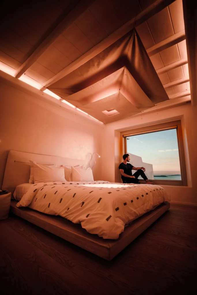This room is all about serene, architectural drama. The low-profile wooden platform bed keeps the focus on the incredible view and the unique ceiling design, which features draped, terracotta-hued fabric. The lighting is subtle and ambient, bathing the room in a warm, low-glow light that highlights the crisp white walls and bedding. It feels like a high-end, modern escape!