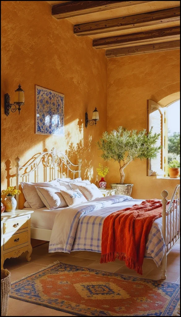 Hello, gorgeous! This bedroom perfectly captures a warm, sunny, Mediterranean farmhouse feel. The rich, textured terracotta-orange walls create an incredible warmth, beautifully contrasted with the crisp white iron bed frame and bedding. The antique rug, olive tree, and exposed ceiling beams ground the space, making it feel authentic and incredibly cozy. That sun-drenched light is the final touch!