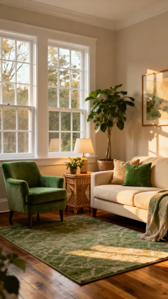 - Dominant Color: Your base—walls or big furniture (e.g., sage green walls).