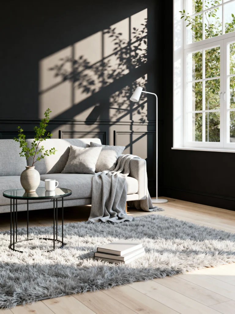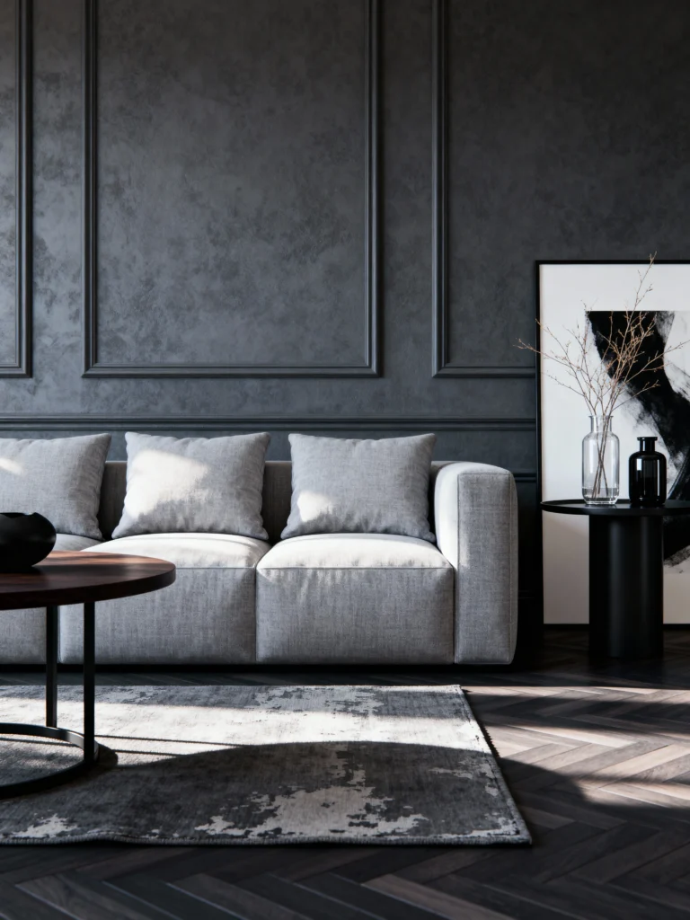 - Why it works: Black walls turn your grey sofa into a rockstar. It’s dramatic, modern, and surprisingly versatile.