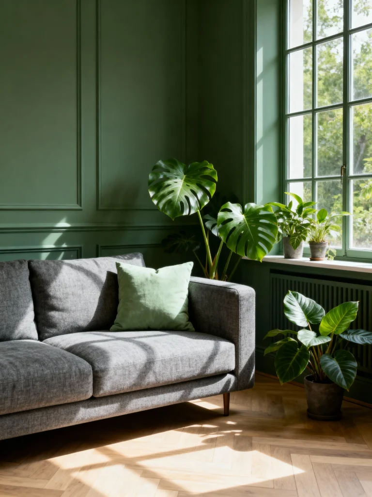 Personal take: I’m obsessed with green walls right now. Green and grey together? It’s alive, it’s fresh, and it’s a great excuse to hoard more plants. 🌿
