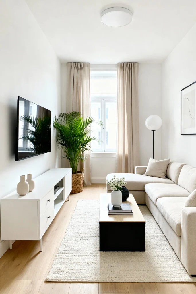 Keep it bright and breezy with crisp white walls and light oak flooring. Anchor the space with a soft, beige sectional sofa for maximum comfort. Add a sleek, white mid-century modern media console to hide away the clutter. Bring in a tall, leafy green palm in a woven basket to breathe life into the corner. Place a minimalist globe floor lamp nearby to cast a soft evening glow. Keep the rug light and textured to tie the whole minimalist vibe together beautifully.