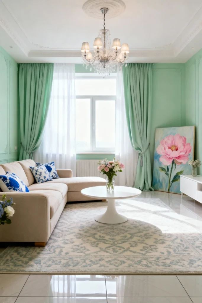Paint your walls a refreshing, minty pastel green for a cheerful vibe. Anchor the seating area with a classic beige sofa, popping it with vibrant blue and white patterned throw pillows. Place a sleek, white tulip-style pedestal table right in the middle. Lean a massive, gorgeous pink peony canvas against the wall to serve as a stunning focal point. Hang a sparkling crystal chandelier overhead to add a serious touch of glamour. Finish with elegant seafoam green curtains to match the walls.
