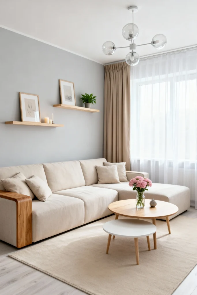 Paint your walls a calming, soft dove grey. Choose a plush, neutral sofa featuring warm wooden armrest details for that perfect Scandinavian touch. Set up a pair of round, light-wood nesting tables in the center—ideal for your coffee and a fresh vase of pink blooms. Mount simple floating wooden shelves above the sofa to display minimalist line art and a few taper candles. Frame the windows with floor-length beige drapes to soften the natural light pouring in.