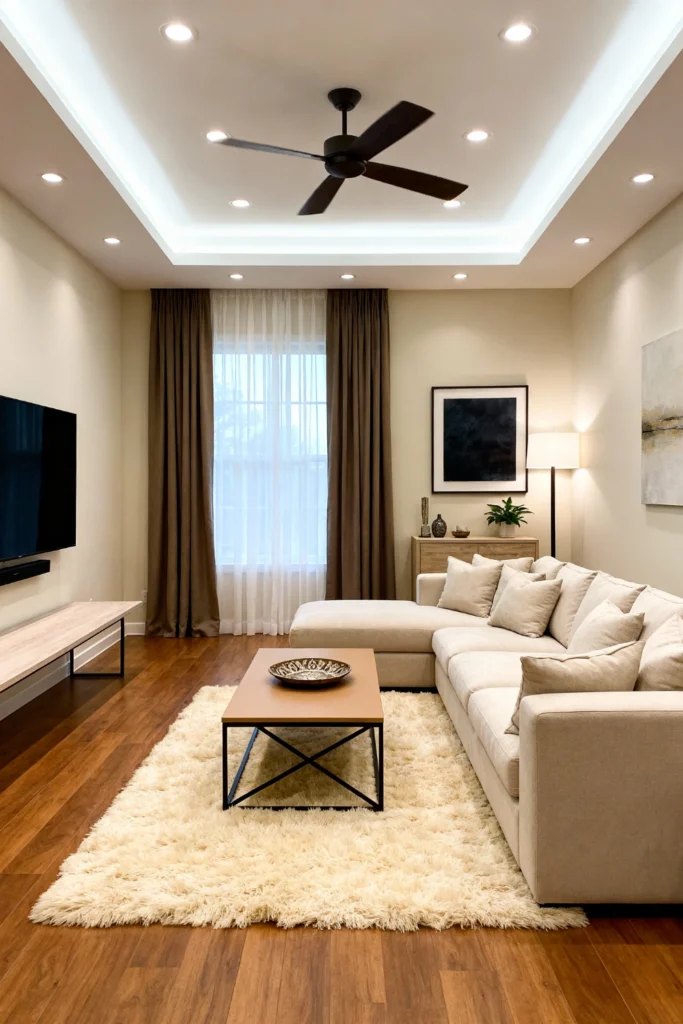 Create a cozy atmosphere with rich, dark hardwood floors. Opt for a large, inviting beige sectional piled high with matching throw pillows. Center the room with an industrial-chic coffee table featuring a warm wood top and black metal legs. Hang rich, chocolate-brown curtains high and wide to make the ceilings feel endless. Add a high-pile, fluffy cream rug underneath to keep things ultra-cozy underfoot. Install a modern black ceiling fan and use recessed lighting to keep the space perfectly illuminated.