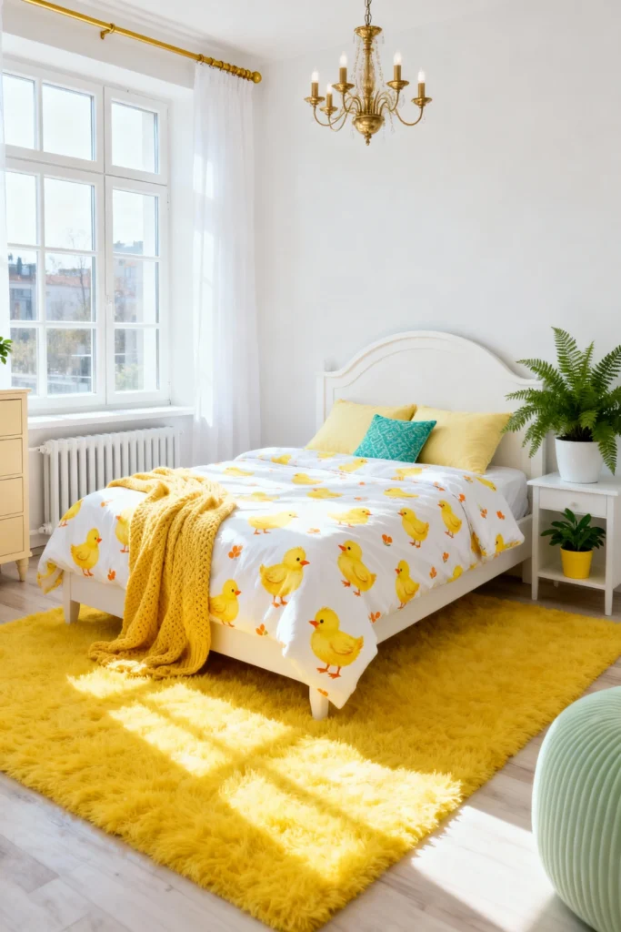 Choose a gentle, arched white wood bedframe to keep the room feeling light and airy. Place a simple white nightstand beside it to hold a cheerful green fern. Opt for playful, white bedding covered in an adorable yellow duckling print. Use a sunshine-yellow, ultra-fluffy area rug to instantly brighten the floor and make the room smile. Drape a chunky, mustard-yellow knit blanket over the edge of the bed for extra coziness. Hang a classic, vintage-style brass chandelier from the ceiling to add a touch of unexpected, timeless elegance.
