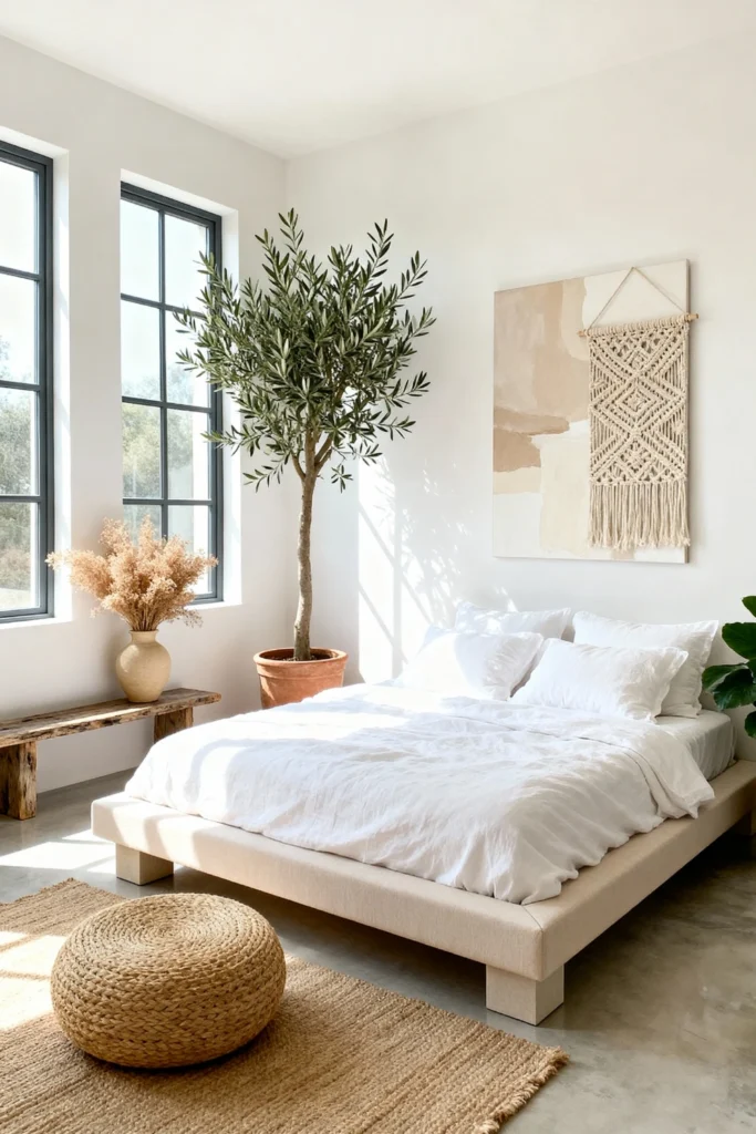 Choose a low-profile, beige upholstered platform bed to keep the room feeling grounded and spacious. Place a beautifully textured, neutral macrame wall hanging above it to add subtle interest. Opt for crisp, breezy white linen bedding to invite pure relaxation. Use a large, weathered terracotta pot to house a stunning, tall olive tree, bringing the outdoors inside. Lay down a natural jute rug and a matching woven pouf to enhance the organic textures. Let the natural sunlight pour through large, black-framed windows to complete this peaceful sanctuary.