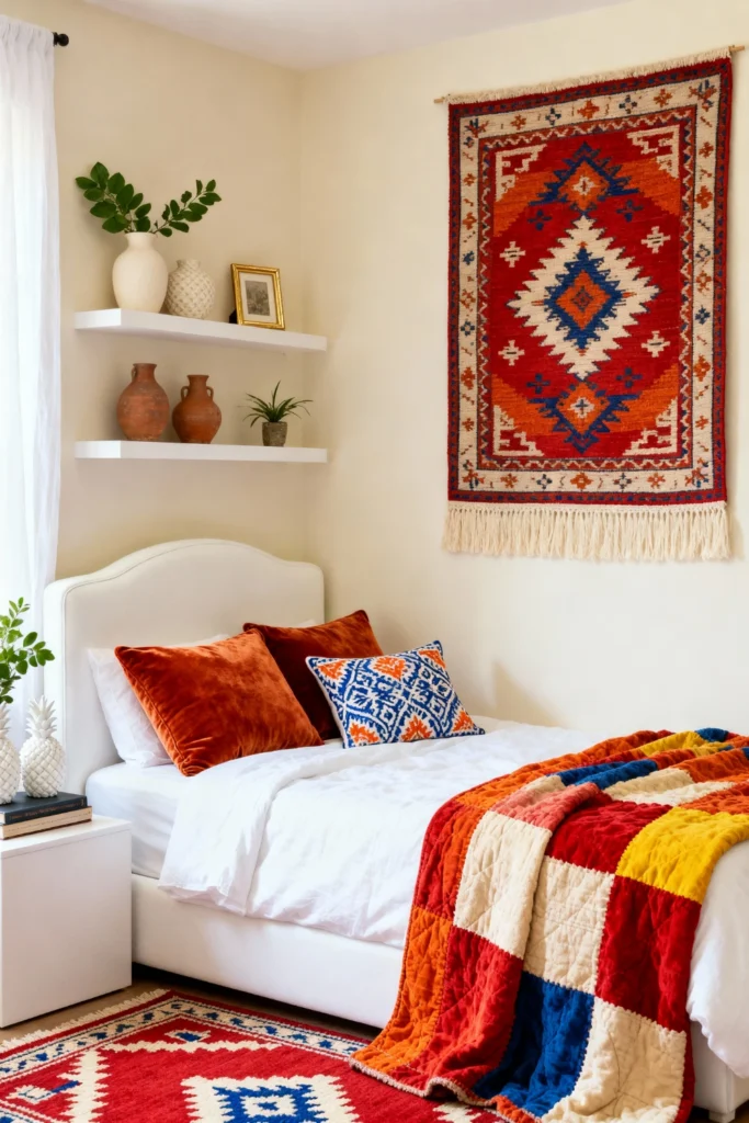 Choose a simple, curved white headboard against a soft cream wall to let your textiles shine. Place bright, burnt-orange velvet pillows alongside a blue patterned cushion for a pop of joy. Opt for a beautiful, multicolored patchwork quilt in primary reds, yellows, and blues to drape over the foot of the bed. Use simple white floating shelves to display rustic terracotta jugs and tiny potted succulents. Hang a large, vibrant geometric tapestry with fringe detailing high on the wall to act as a stunning, woven piece of art.