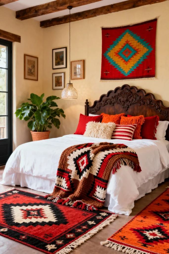 Choose an ornate, heavily carved dark wood headboard to serve as the stunning centerpiece of the room. Place bright red and textured orange pillows against crisp white sheets. Opt for a thick, textured blanket featuring traditional geometric patterns in terracotta, black, and cream to drape across the bed. Use matching patterned rugs to warm up the smooth floor. Hang a large, vibrant woven tapestry above the bed to draw the eye up. Finish the look with a leafy green plant in a simple terracotta pot to breathe life into the earthy space.