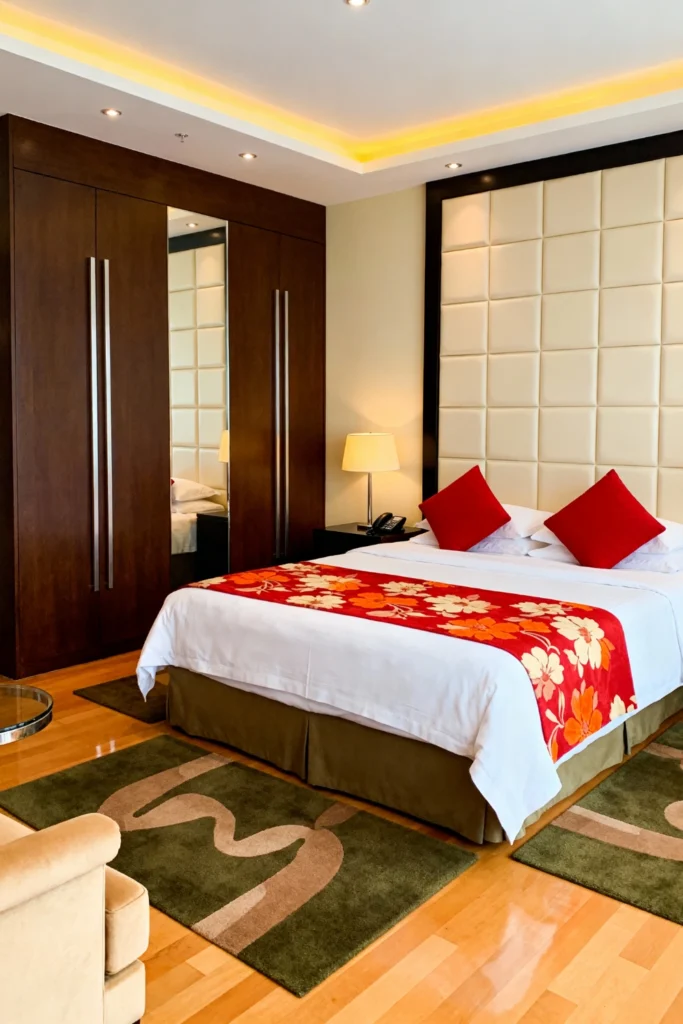 Choose a massive, cream-colored tufted leather headboard that stretches to the ceiling for instant luxury. Place sleek, dark wood built-in wardrobes nearby with metal hardware and mirrored panels to reflect the light. Opt for pristine white hotel-style bedding, but add a pop of energy with a bright red floral bed runner and matching red accent pillows. Use warm, hidden LED lighting in the tray ceiling to cast a soft, inviting glow over the entire room. Add abstract, earthy green rugs over the polished wood floor for a soft place to land.