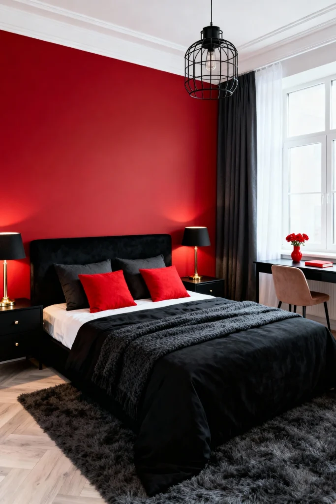 Paint a rich, passionate red accent wall to set a dramatic tone. Choose a luxurious black velvet bedframe and outfit it with dark, charcoal bedding. Place sleek black nightstands beside the bed, topping them with warm brass lamps to cast a soft, inviting glow. Opt for bright red throw pillows to echo the wall color. Use a plush, dark grey faux-fur rug underfoot for ultimate morning comfort. Hang a modern, black wire cage pendant light above to add an edgy, contemporary touch to the room.