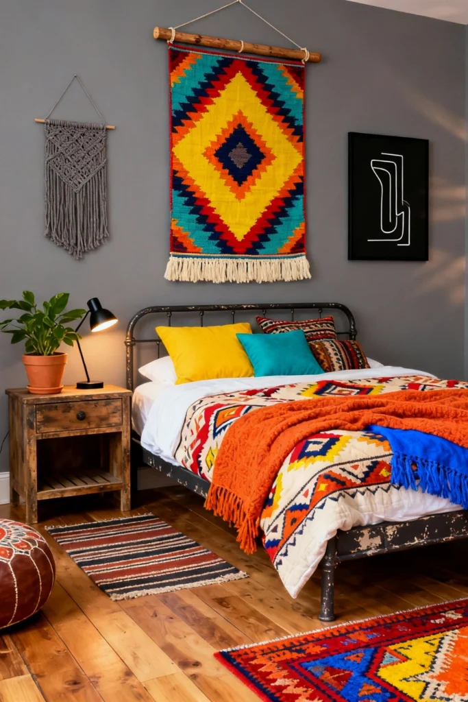Choose a distressed, vintage-style metal bedframe to anchor the room against a cool grey wall. Place a rustic, reclaimed wood nightstand next to it—perfect for a small potted plant and a reading lamp. Opt for a vibrant, geometric-patterned quilt in shades of orange, yellow, and blue. Use a matching Southwestern-style tapestry and hang it proudly above the bed using a natural wooden branch. Toss a few bright, solid-colored pillows on the bed to pull out the colors of the tapestry, and lay down a colorful striped rug to complete the vibe.