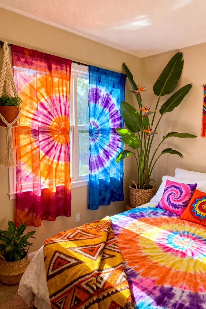 Choose vibrant, semi-sheer tie-dye curtains in warm oranges and cool blues to bathe the room in colorful sunlight. Place a massive, lush Bird of Paradise plant in a woven basket right by the window. Opt for a bedspread featuring a massive, bright rainbow spiral pattern to fully embrace the hippie aesthetic. Use a contrasting yellow and brown geometric blanket at the foot of the bed to mix up the patterns. Hang a textured macrame plant holder in the corner to keep the bohemian, free-spirited energy flowing from floor to ceiling.