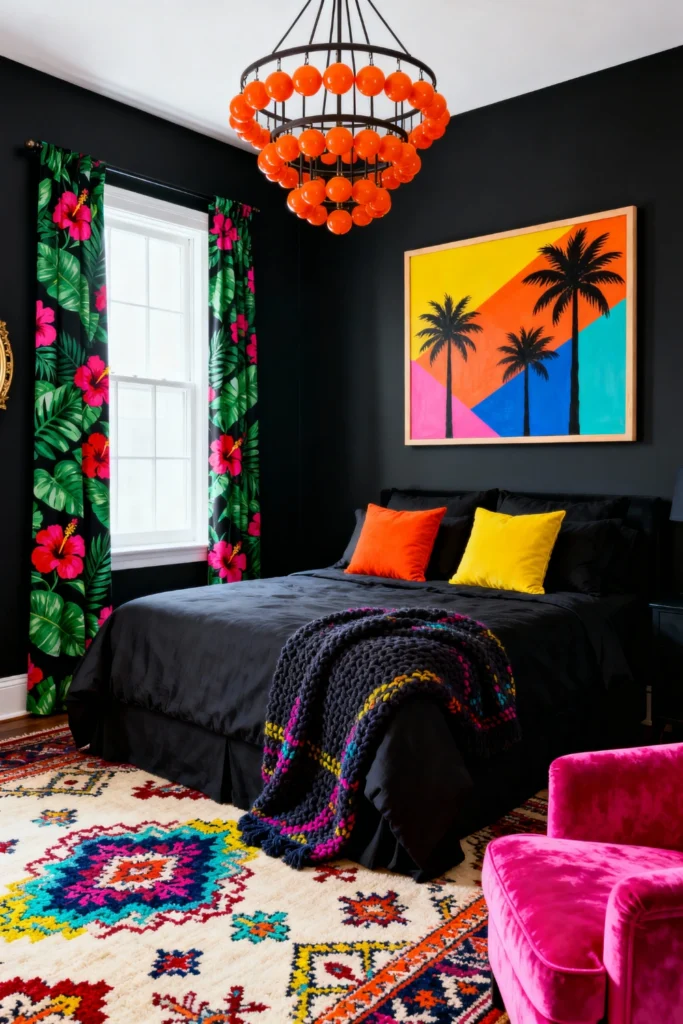 Paint your walls completely black to create a bold, dramatic canvas. Choose striking, oversized floral curtains featuring massive hot pink hibiscus flowers and bright green leaves. Place a sleek black bed frame and outfit it with matching dark bedding. Opt for bright yellow and orange velvet pillows, and drape a dark, chunky knit throw with rainbow accents across the bed. Hang a glowing, bright orange bubble chandelier from the ceiling for a funky focal point. Add a vivid, neon-colored painting of palm trees to tie this wild look together.